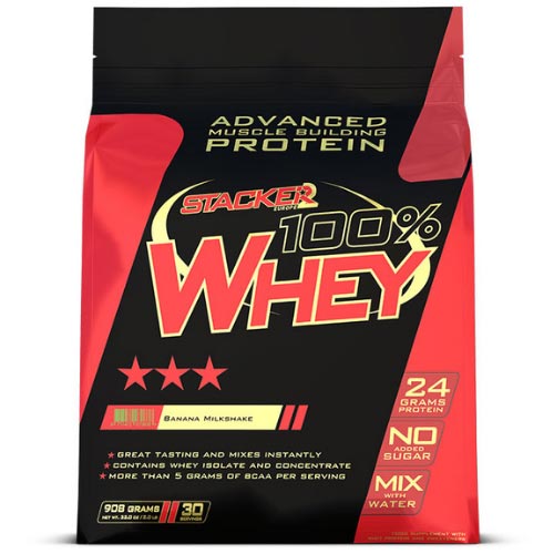 100% WHEY van STACKER2 is jouw favoriete eiwitshake! 100% WHEY STACKER2 EIGENSCHAPPEN: 100% Whey staat niet alleen bekend om de lekkere smaak, maar staat vooral bekend als het perfecte Proteïne supplement als basis binnen jouw training. Iedereen heeft baat aan 100% Wei. Binnen vrijwel iedere tak van sport, tijdens perioden van herstel na fysieke inspanning, of als eiwitaanvulling in een vegetarisch dieet. ONGEKEND HOGE VOEDINGSWAARDE. De meeste populaire Proteïnes bevatten, als je goed naar het label kijkt, een hoog percentage Koolhydraten. Laat je niet voor de gek houden! Jij wilt Proteïne, geen Weight Gainer. Daarom bevat 100% Whey een hoog percentage aan de beste kwaliteit Eiwitten. In 100% Whey zijn de bio actieve eigenschappen van whey intact gebleven. Verder profiteer je bovendien van de positieve eigenschappen van Fosfolipiden, Immunoglobuline en Lactoferrine. Iedere dosering van 30 gram bevat 24 gram hoogwaardige Proteïne. Dit bestaat voor maar liefst 45% uit essentiële