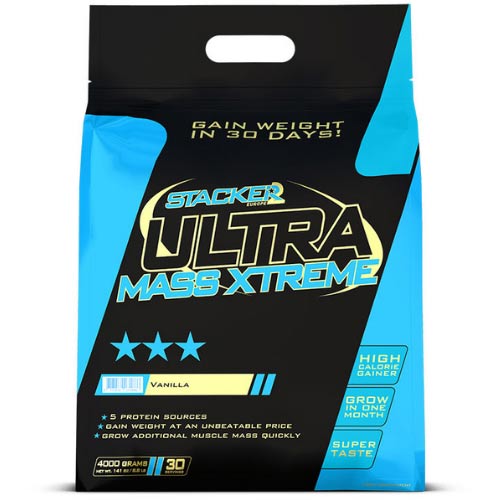 ULTRA MASS XTREME van STACKER2 is dé gainer die jou het meeste waar geeft voor je geld. Je zult gegarandeerd niet teleurgesteld zijn! ULTRA MASS XTREME STACKER2 EIGENSCHAPPEN: Stacker2 Europe heeft twee gainers in haar assortiment. Daar waar Giant Mass Gainer is ontwikkeld voor de gevorderde atleet, is Ultra Mass Xtreme ontwikkeld voor de beginnende krachtsporter die voor weinig geld een topproduct zoekt. Ultra Mass Xtreme wordt door ons gezien als de gainer met de beste prijskwaliteit verhouding. Deze gainer heeft een grote dosis calorieën, essentiële Eiwitten en Aminozuren, plus Koolhydraten. Enkel eiwitten van de hoogste biologische waarde. Dus geen plantaardige bronnen, maar zuivelbronnen. Voor de snelle opname bevat Ultra Mass Xtreme een combinatie van wei proteïne isolaat en wei proteïne concentraat. Daarnaast bevat deze formule ook eiwitten die vertraagd worden afgegeven aan jouw spieren: micellar casein. Ultra Mass Xtreme is een betrouwbare en veilige gainer voor de beginnende
